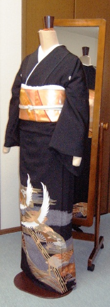 後ろ姿にものし柄と飛び鶴がすっきりと描かれております。 帯も金糸をたっぷり使用した西陣の高級袋帯をセットで。。。長尺ですので背中やヒップを強調せずに、たっぷりとした大きめの二重太鼓が結べます。