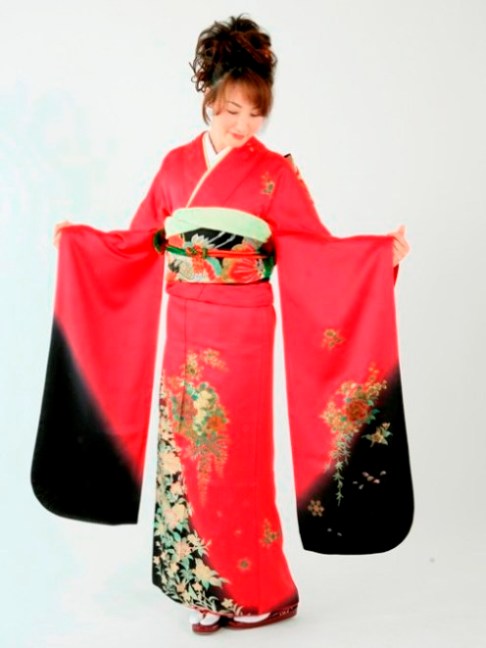 光沢の美しい赤でお顔の色を色白に明るく見せながら、裾のほうが黒に変わる振袖は、すっきりとスタイル良く見える効果も。。。