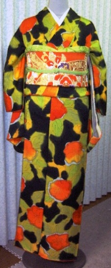 帯は西陣の黒地の帯を結びましたが、金地、グリーンなどお好みで合わせやすい着物です。