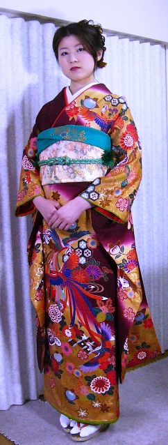 両袖にも鳳凰と花柄などが金色を用いて、所狭しと描かれています。